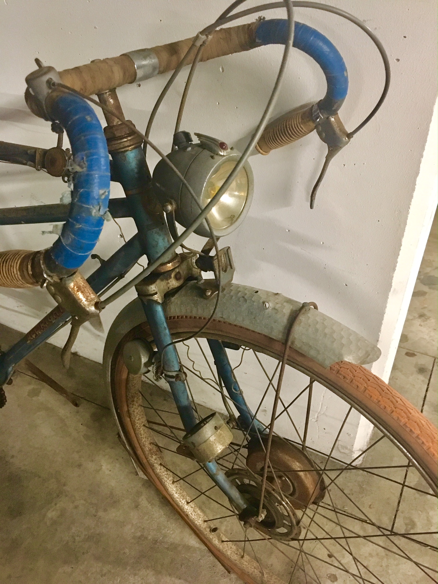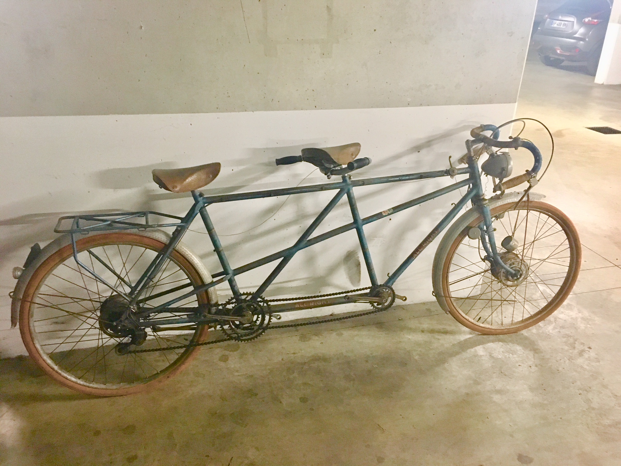 Voici le Tamdem tel que je l'ai récupéré cette semaine. Beaucoup de travail de démontage et nettoyage, mais le jus est super! la peinture d'origine avec les transferts et les filets, les accessoires... Seules les selles (années 60) le feu arrière et quelques bricoles sont à changer..
