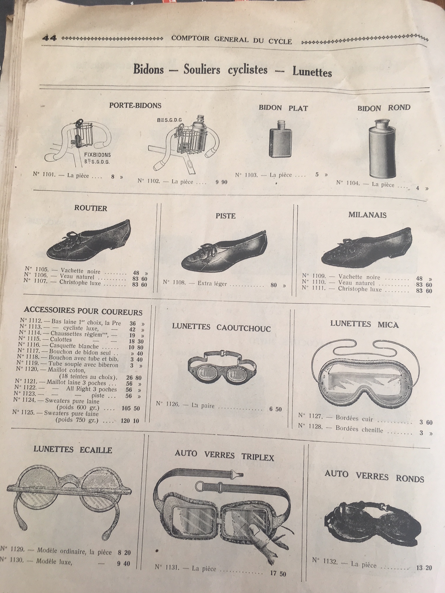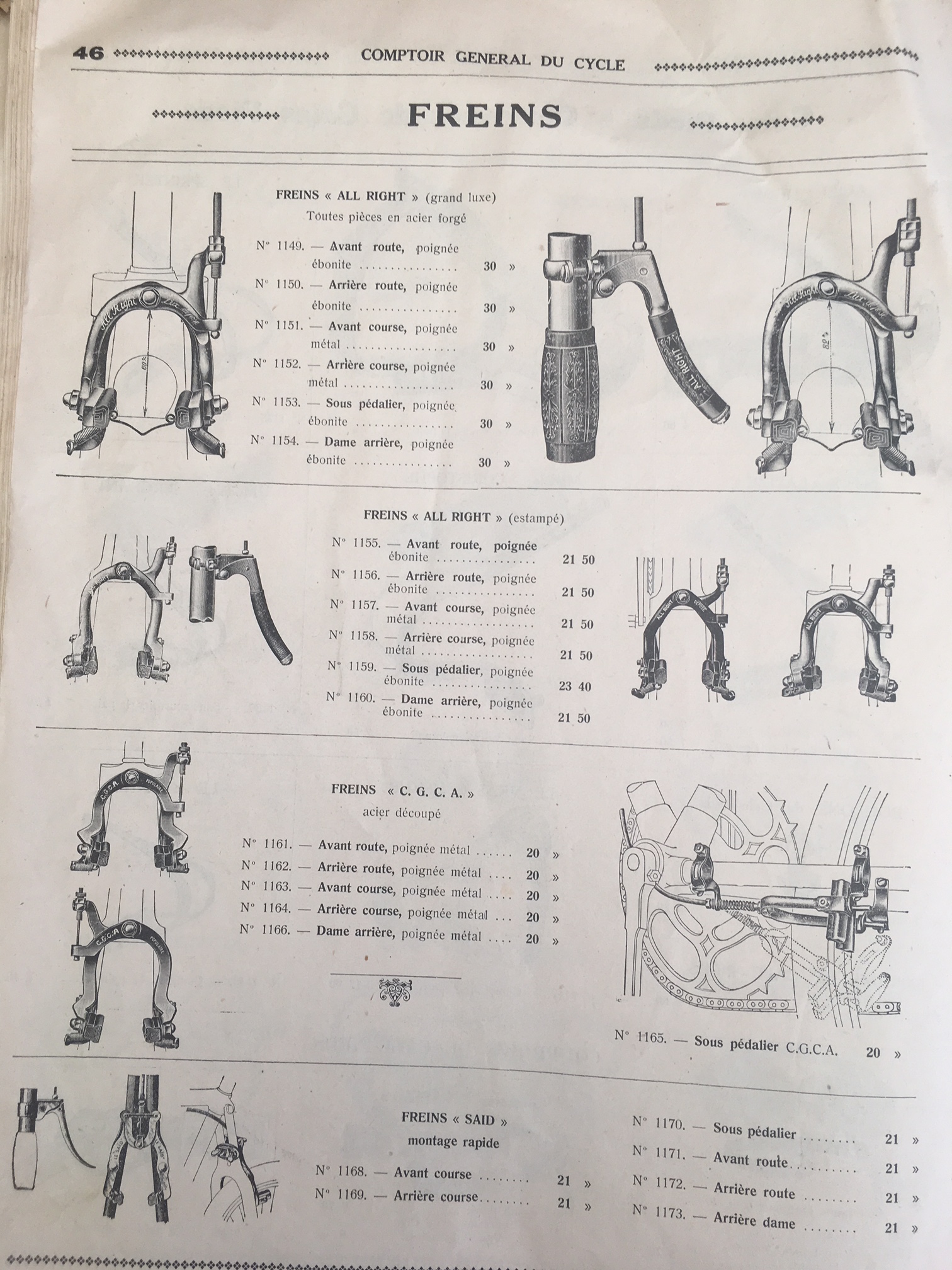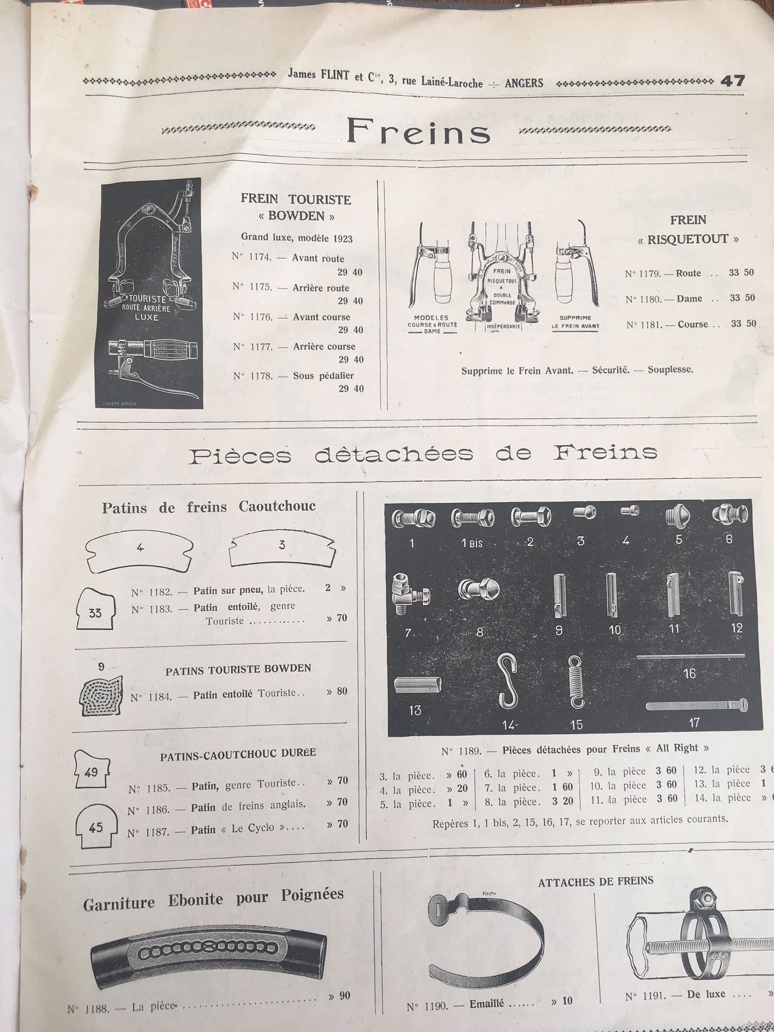 J'ai bien entendu dans l'idée de remettre en état le vélo et le tandem, et vous livre un extrait du catalogue plutôt très complet, où je découvre entre autre, que les pédales à plateformes Berthet sont déjà disponibles en 1927...