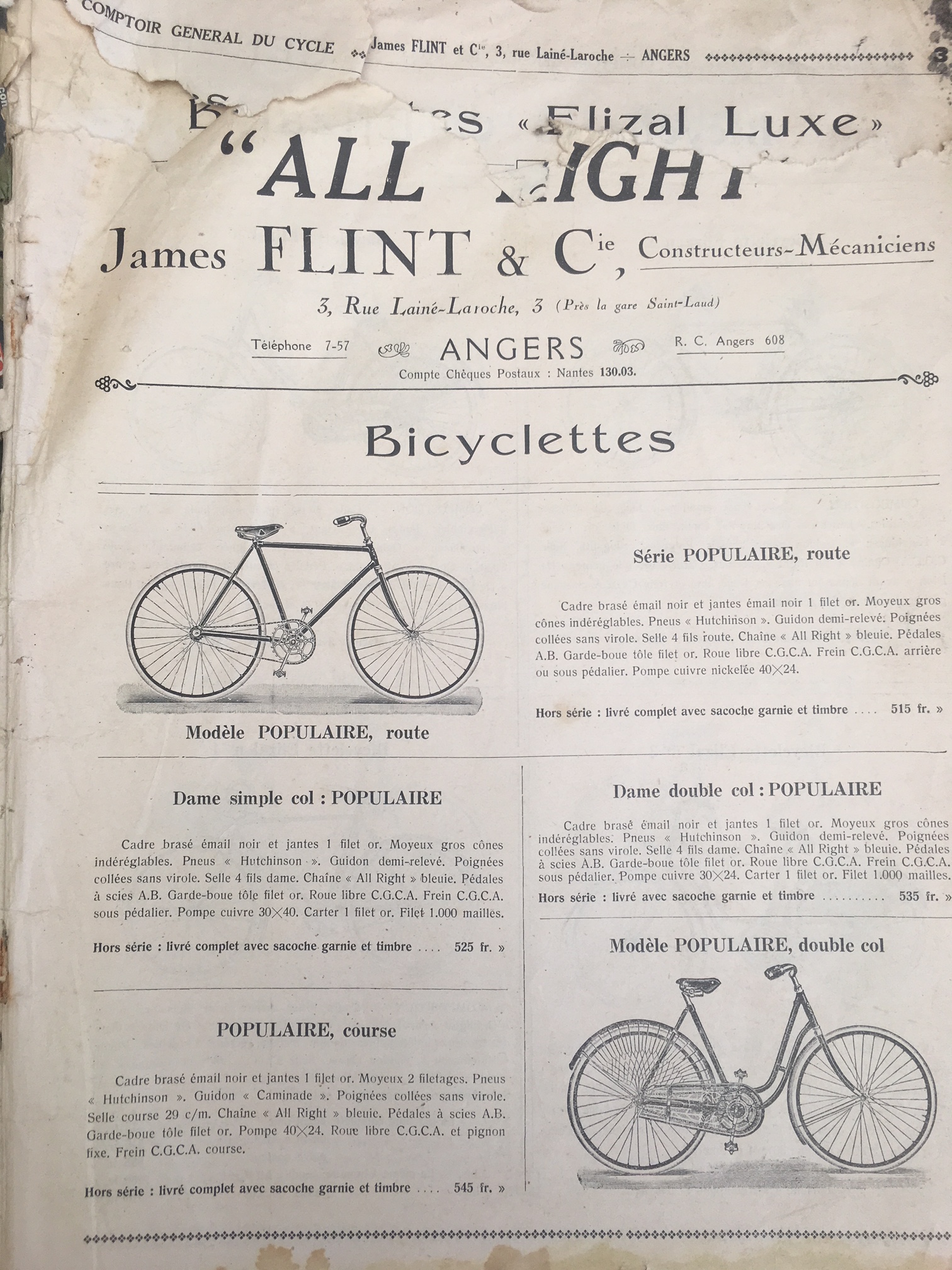 Je me suis récemment installé à Angers, et me suis tout naturellement intéressé à la production locale... Globalement active des années 1900 à 1950. Deux manufactures se détachaient plutôt du lot: "Continental" et "All Right". il y avait d'autres constructeurs qui ont eu une activité plus éphémère.