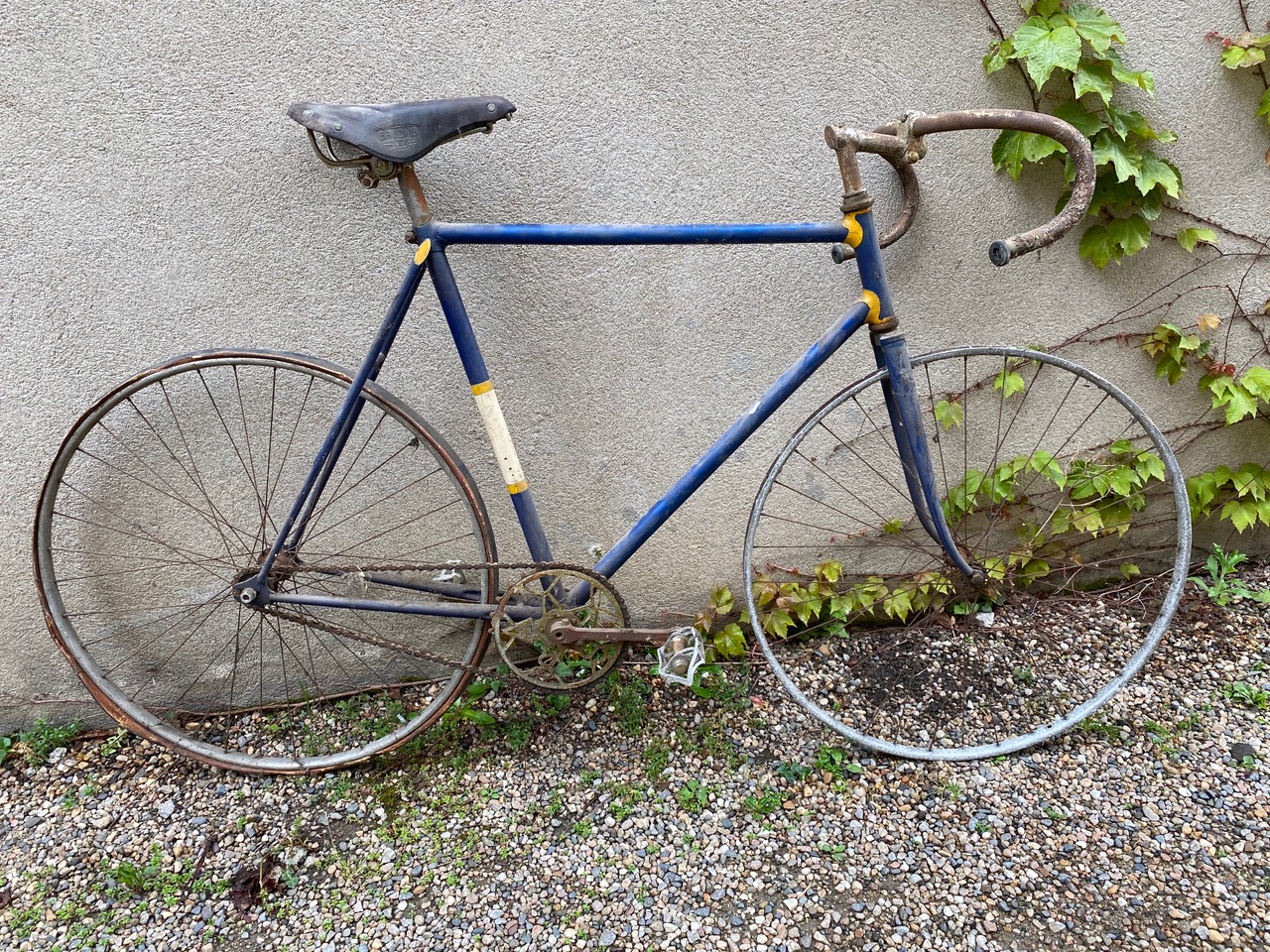 voilà un cadre qui m'intrigue, pas de marques apparente la plaque à disparue… l'émaillage (style peugeot années 60). Le pédalier BSA et cette chaine me laisse penser que le cadre est plus ancien.
