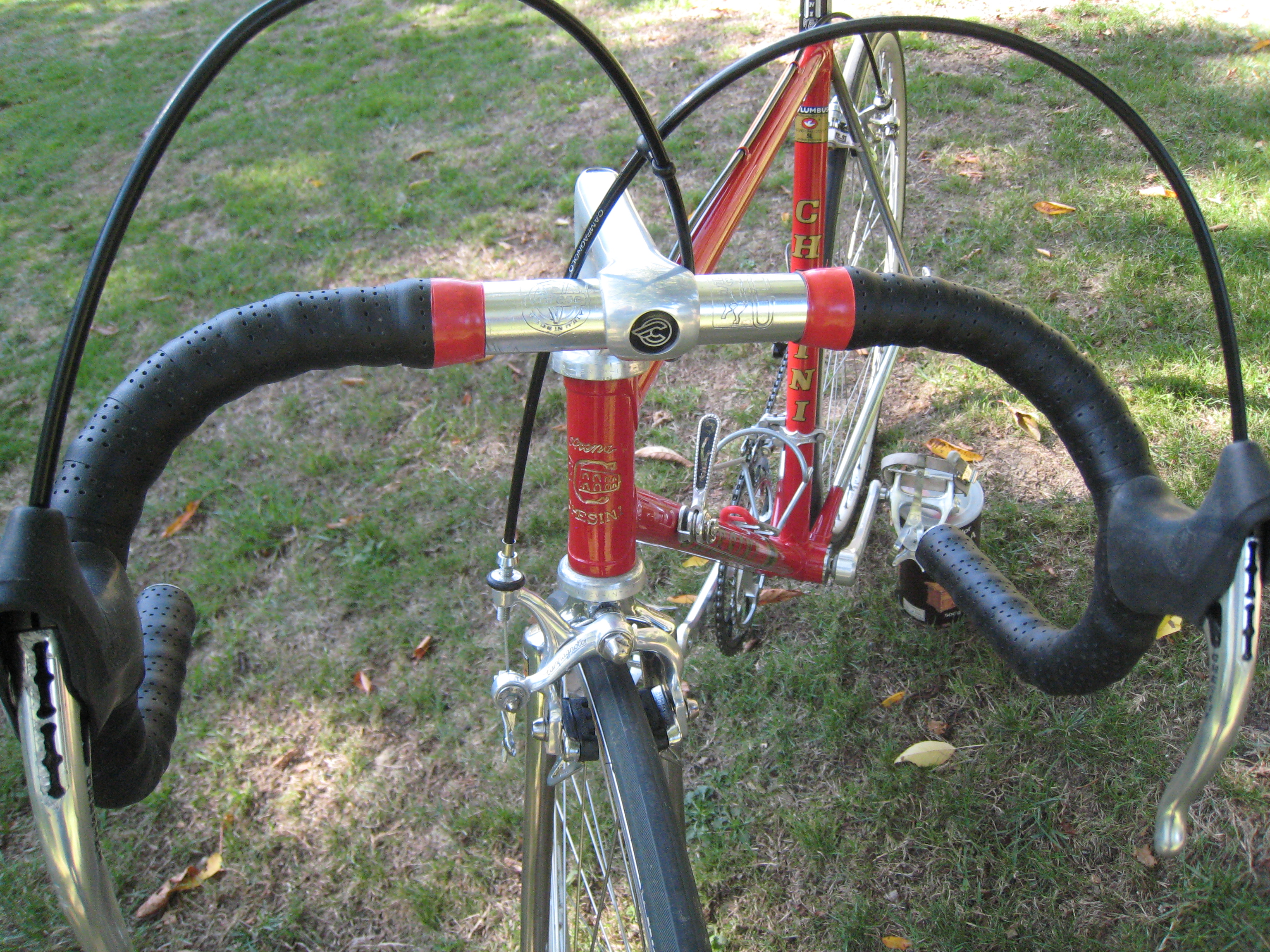 Le premier vélo que j'ai monté au départ d'un cadre acquis dans le Sud de la France est un Chesini Arena. Je l'ai fait repeindre par un ami carrossier et je l'ai équipé de pièces Campagnolo, acquises sur le Net et dans des bourses chez moi en Belgique. Récemment, j'ai monté des pièces pantographiés Chesini Précision. Je ne suis pas un inconditionnel des pièces pantographiées, mais j'avais ici l'occasion d'acquérir le groupe complet et je n'ai pas résisté.