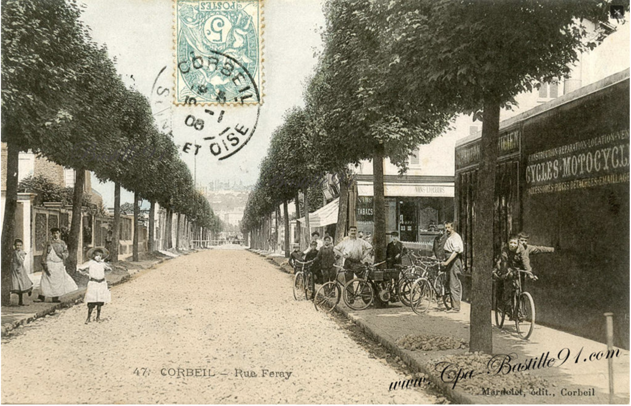 "Aujourd’hui une carte de Corbeil en clin d’oeil à Jacques …! Pas toujours facile de trouver des cartes peu courantes de grandes villes comme Corbeil et autres villes importantes de l’Essonne. Cette carte est assez connue mais son animation vaut la peine de s’y intéresser quand même. Au premier coup d’oeil on remarque que la route est en réparation et vu la grosseur des cailloux, le propriétaire du magasin et mécanicien de cycles-motocyclettes Mr Beuzon a dû avertir ses clients de rouler pour l’instant sur le trottoir. Le maire de Corbeil à cette époque est Mr Garnier et on compte 9902 habitants qui vivent dans cette ville agréablement située à 40 kilomètres de Versailles et 33 kilomètres de Paris. " source www.cpa-bastille91.com