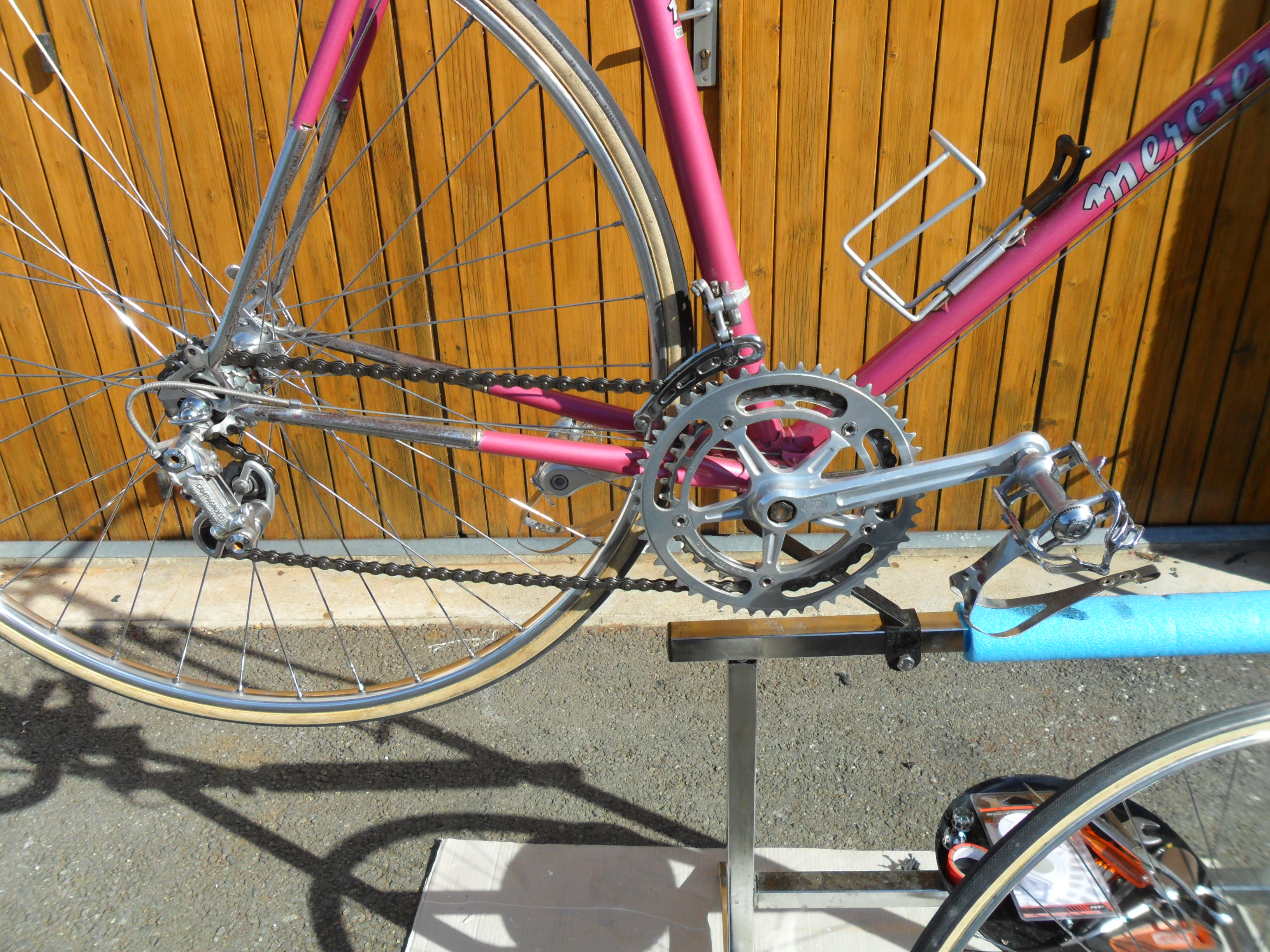 Un démontage complet , nettoyage chrome et peinture, graissage, remontage, l'ensemble des roulements était en excellent état, dommage que ce vélo ait été stocké de nombreuses années à l'humidité .... la peinture est resté en parfait état et pas du tout décolorée comme bon nombre de Mercier... seuls les boyaux , les courroies et la guidoline ont été changées.