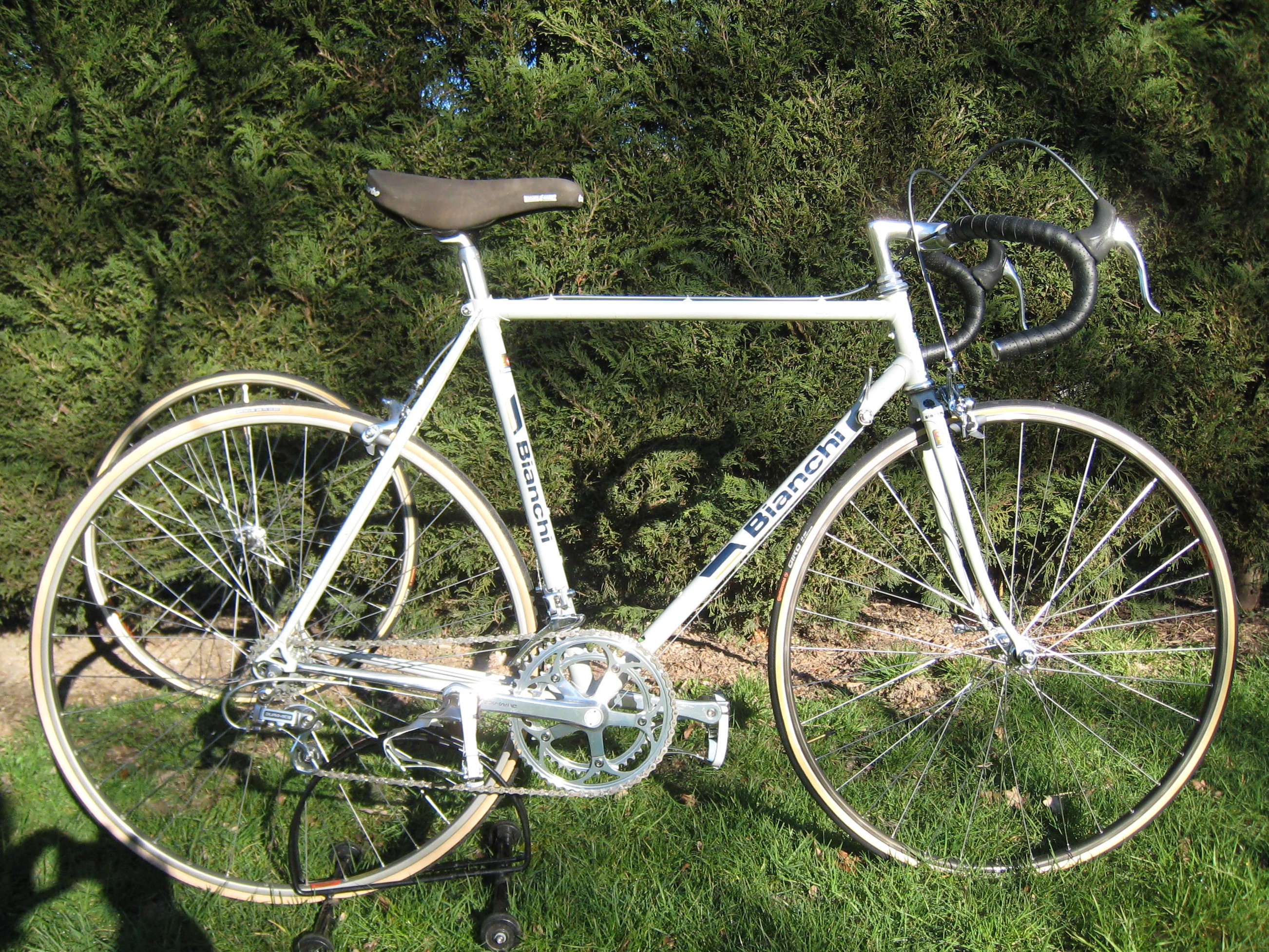 Sur base d'un cadre acheté sur le Net, j'ai monté ce Bianchi selon le catalogue Bianchi Allemagne. En d'autres termes avec un équipement de base Dura-Ace, une tige de selle et une vis de serrage Gipiemme, une potence pantographiée et un cintre 3ttt, des jantes Mavic GL330, une selle Turbo... J'ai préféré garder le cadre dans sa livrée d'origine malgré les défauts. Seule entorse à l'origine des boyaux Continental Giro plutôt que les Clément.