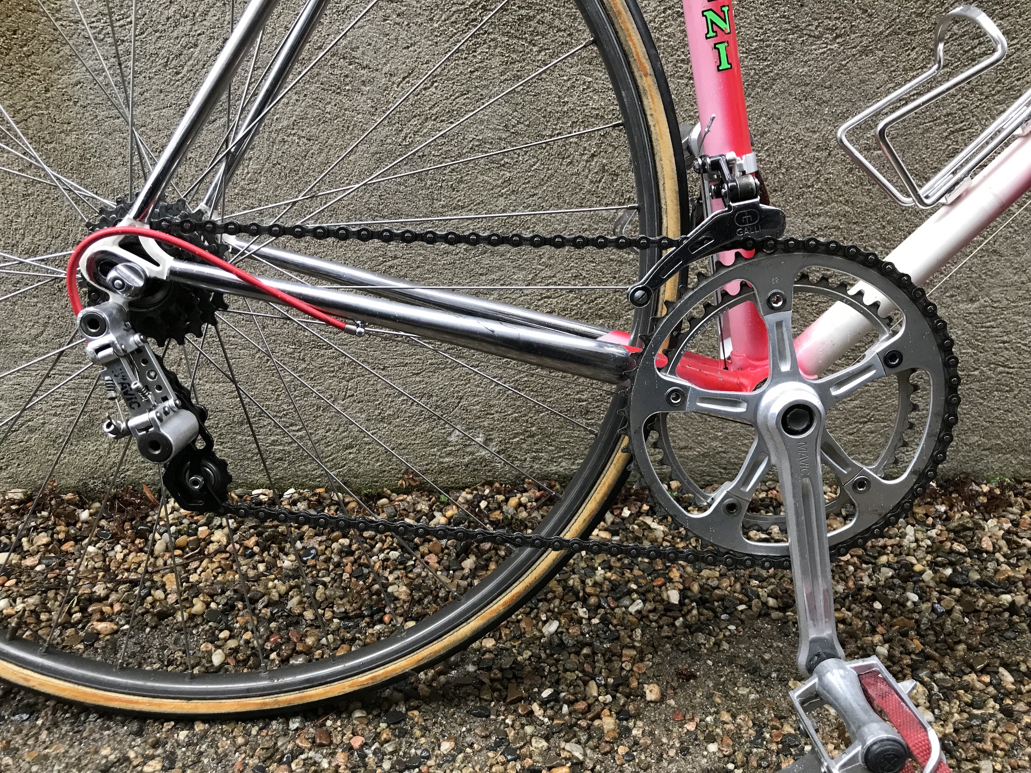Périphériques sympathiques sur ce vélo, les connaisseurs apprécient ce matériel Mavic : du matos français... encore que les freins ... Mavic Modolo ou Modolo Mavic ... Le cintre et la potence, pas courant .