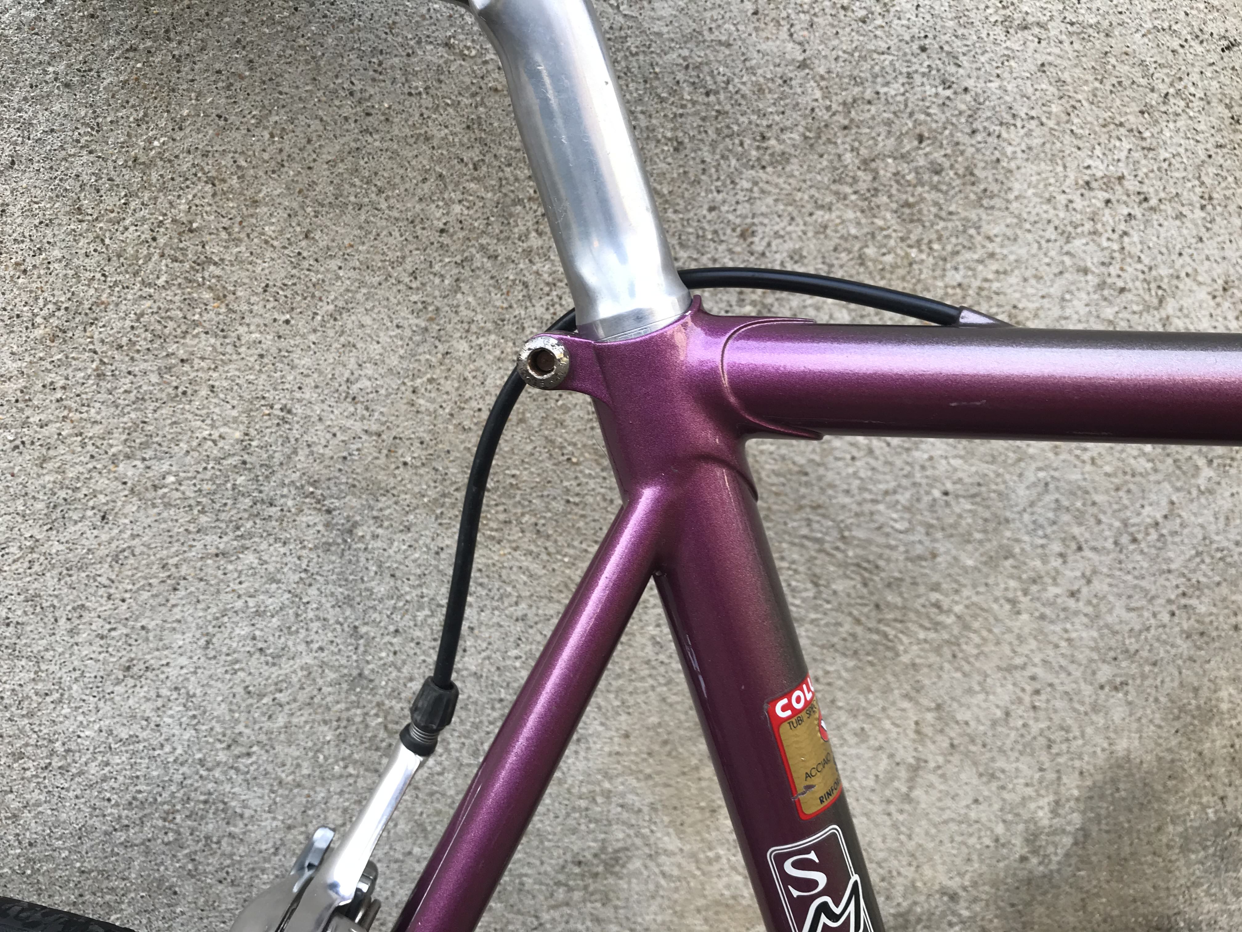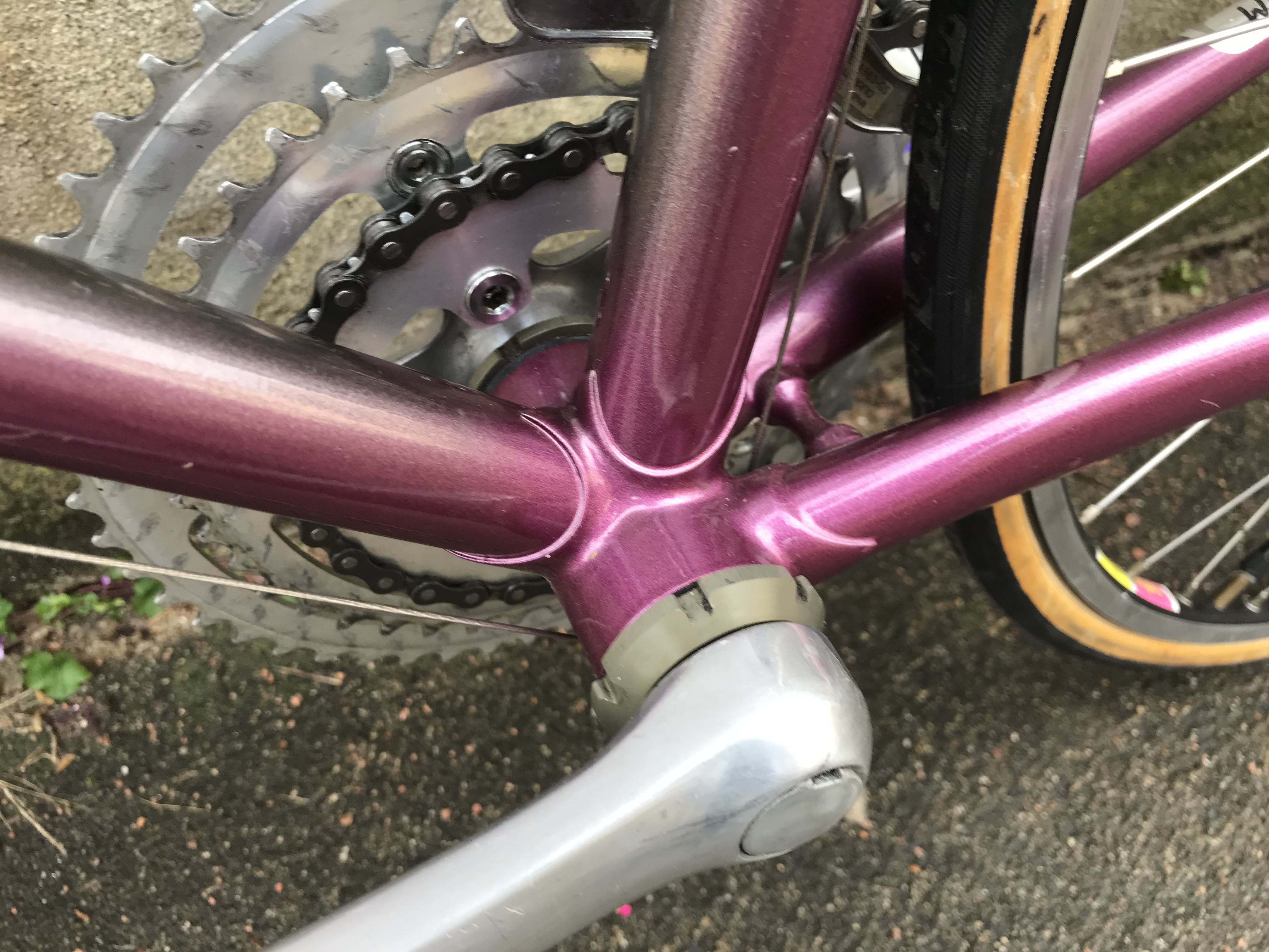Chouette cadre ! on dirait qu'il possède un boitier de pédalier Mavic avec les "cuvettes" montées à l' envers ( habituellement on fraisait la boite de pédalier à 45° pour mettre les cuvettes dans l'autres sens, mais peut être est ce aussi un matériel que je ne connais pas...