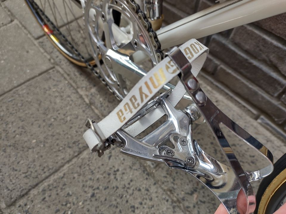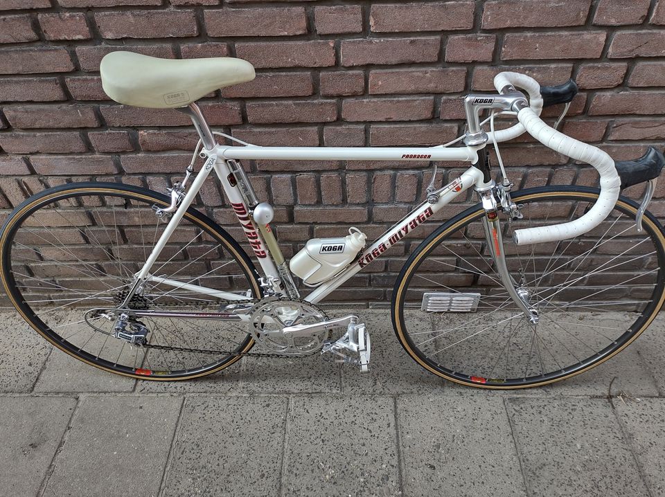 Je viens d'avoir la chance de pouvoir acquérir un Koga Miyata Proracer de 1986 en état totalement neuf et, qui plus est, à ma taille. Une opportunité rare de tomber sur un tel bijou. Non seulement il est comme neuf mais, en prime, pourvu de tous les accessoires (pompe, bidon, courroies...)
