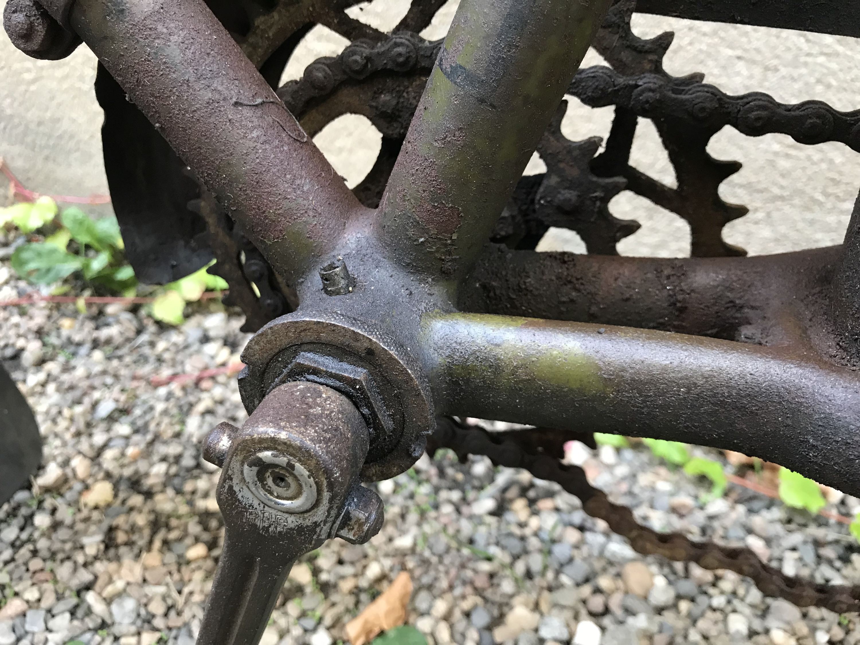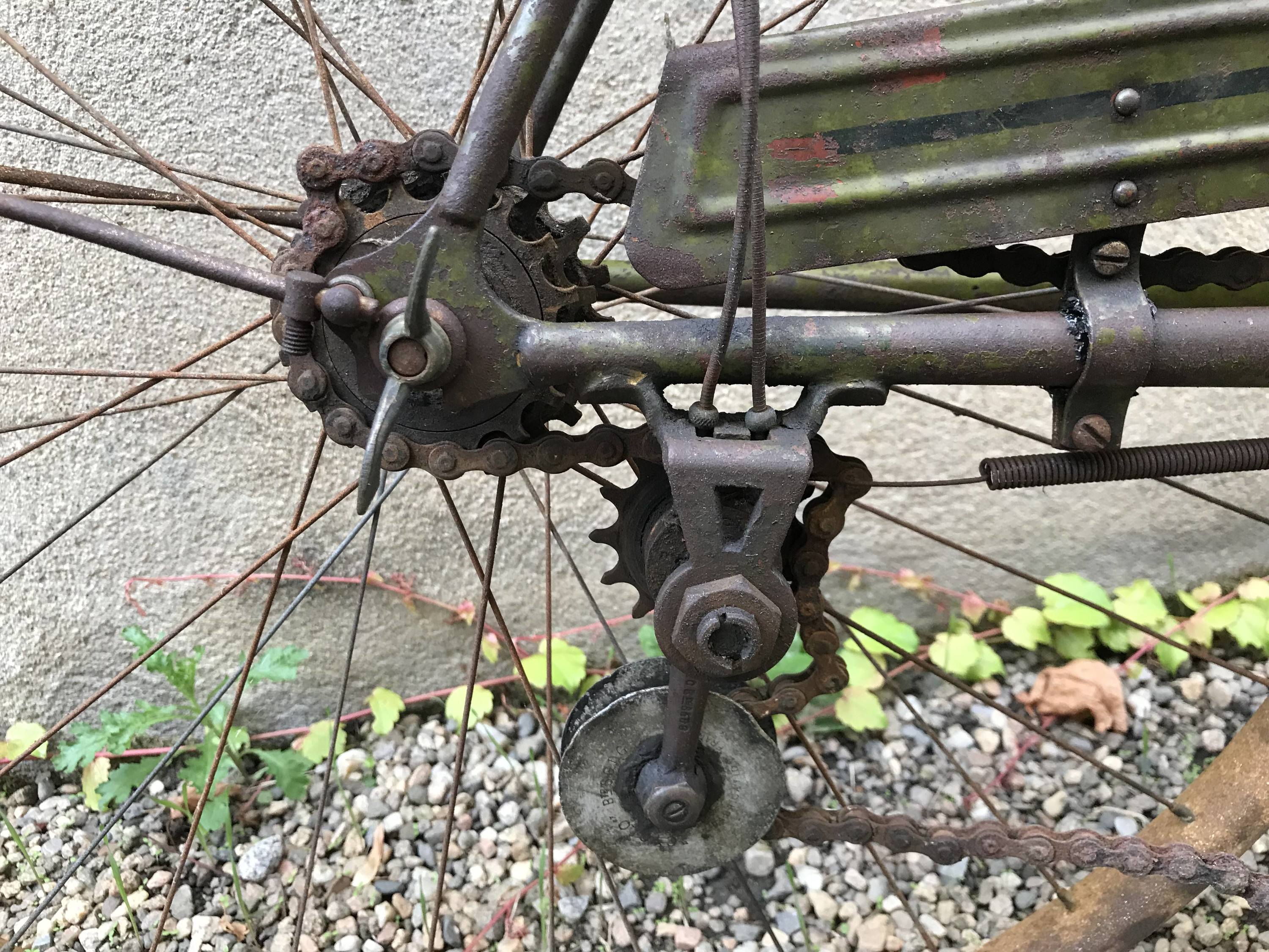 Du bien utilitaire, bien costaud avec le "panachage" du dérailleur et de la manette des deux générations successives qui, si cela est d'origine placerait le vélo au plus tôt fin 1938. Mais rien n'interdit de le voir plus ancien avec la manette remplacée plus récemment.