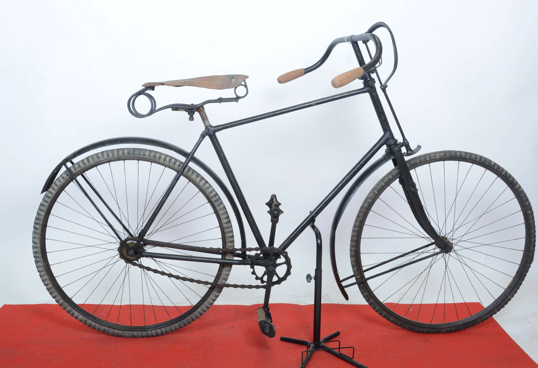 Taille de cadre 55 cm, frein avant à tringle et patin sur pneu, selle en cuir sur 4 ressorts.