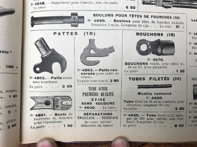 Comme les deux haubans présentaient des enfoncements dans leur partie basse, j'ai un peu rechargé en laiton et tenté de rendre ça de nouveau rond. Quelqu'un a-t-il une idée sur l'époque de ce genre de construction : des pattes —des œillets, par exemple— brasés en bout de tubes ronds constants ? Sur un catalogue (Établissements Prefer, France, vers 1932) destiné aux détaillants en vélos, on trouve les pièces de fonte malléable en question, pour réparation (ou construction ?). J'ai repercé les évents de brasage bouchés par la corrosion en profitant de l'acide disponible pour traiter l'intérieur des tubes.