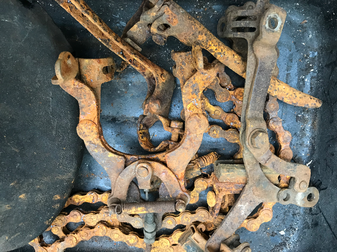 Tout ou presque a trempé dans l'acide phosphorique, puis a été brossé, passé au rouleau d'atelier ou au goupillon d'abrasif puis rebadigeonné de destructeur de rouille. Normalement, on relève une numérotation frappée à ce niveau d'intimité : et bien non, pas une marque à part un "O3" sur un des œillets des têtes de haubans fondues. Rien sur le boîtier de pédalier, ni le raccord de selle, ni même une base. Ce cadre a échappé aux moyens de contrôle de l'industrie, et n'est jamais rentré dans une administration (l'armée allemande datait et numérotait les cadres de ses vélos).