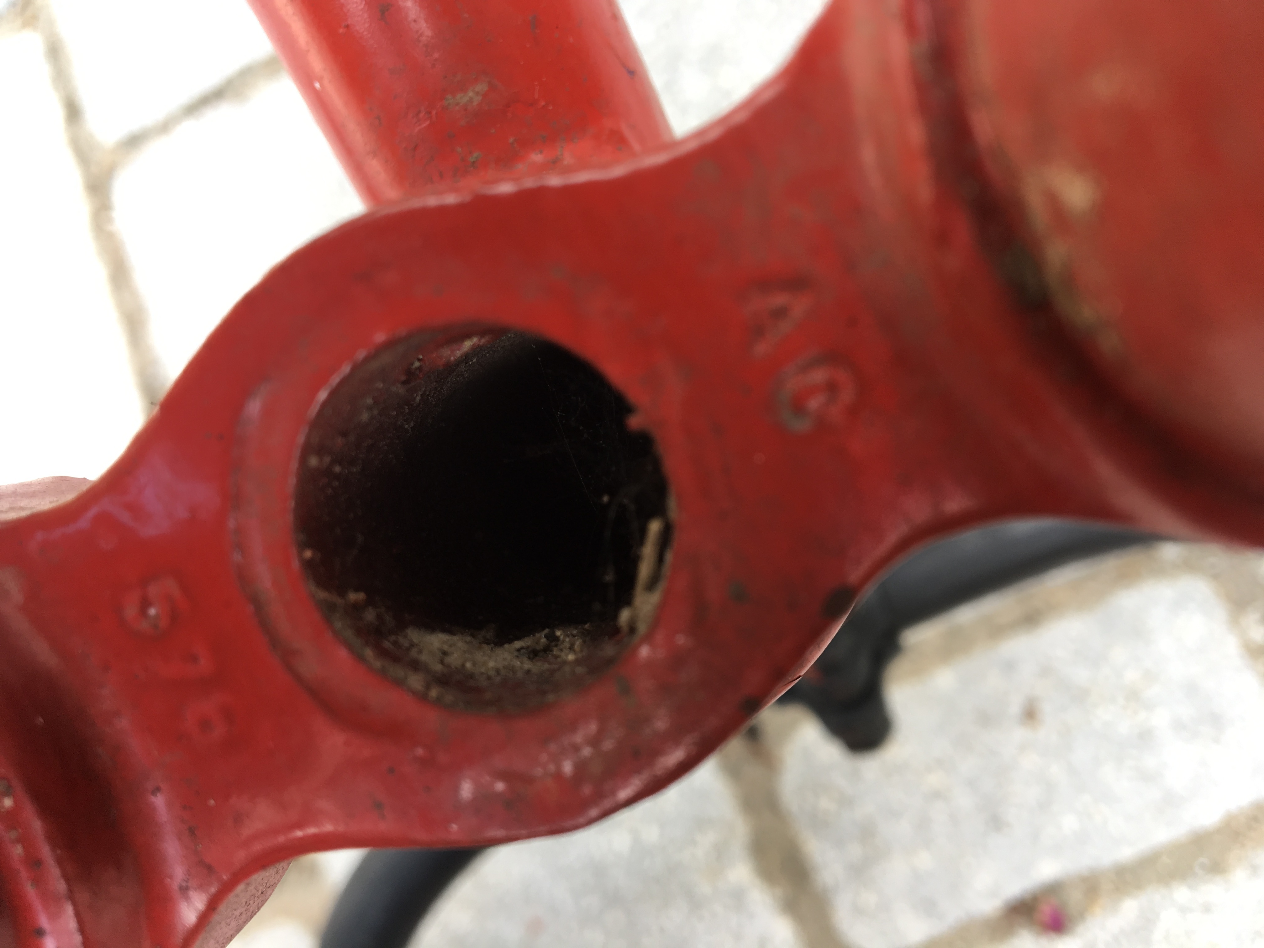 Voilà un bien joli petit vélo qui a tout pour un grand, vélo de cirque, vélo de démonstration piste ? je suis bien pressé de l'avoir entre le mains pour le détailler et enlever cette vilaine selle et cette roue arriere qui n'a pas l'air d'origine. Une soudure de réparation vers le pedalier sur le hauban gauche.